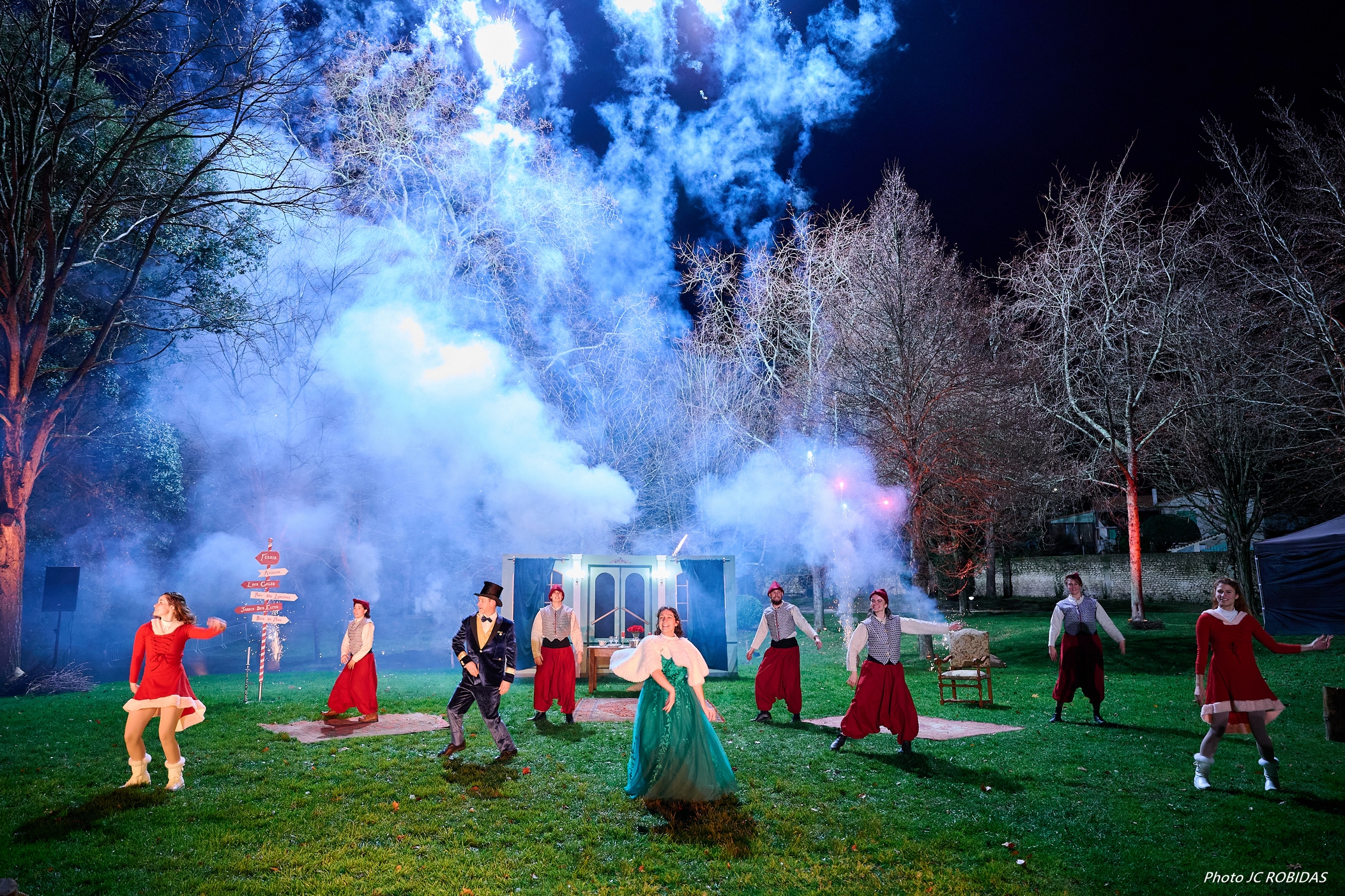 Véritable spectacle d’un seul tenant sur un seul et même lieu agrémenté de lumières sur bâtiments (s'il y en a) et de pyrotechnie de proximité en arrière-plan. Selon le lieu, possibilité d’intégrer des options comme un spectacle de feu complet, un feu d’artifice de Noël, un spectacle de lumières.